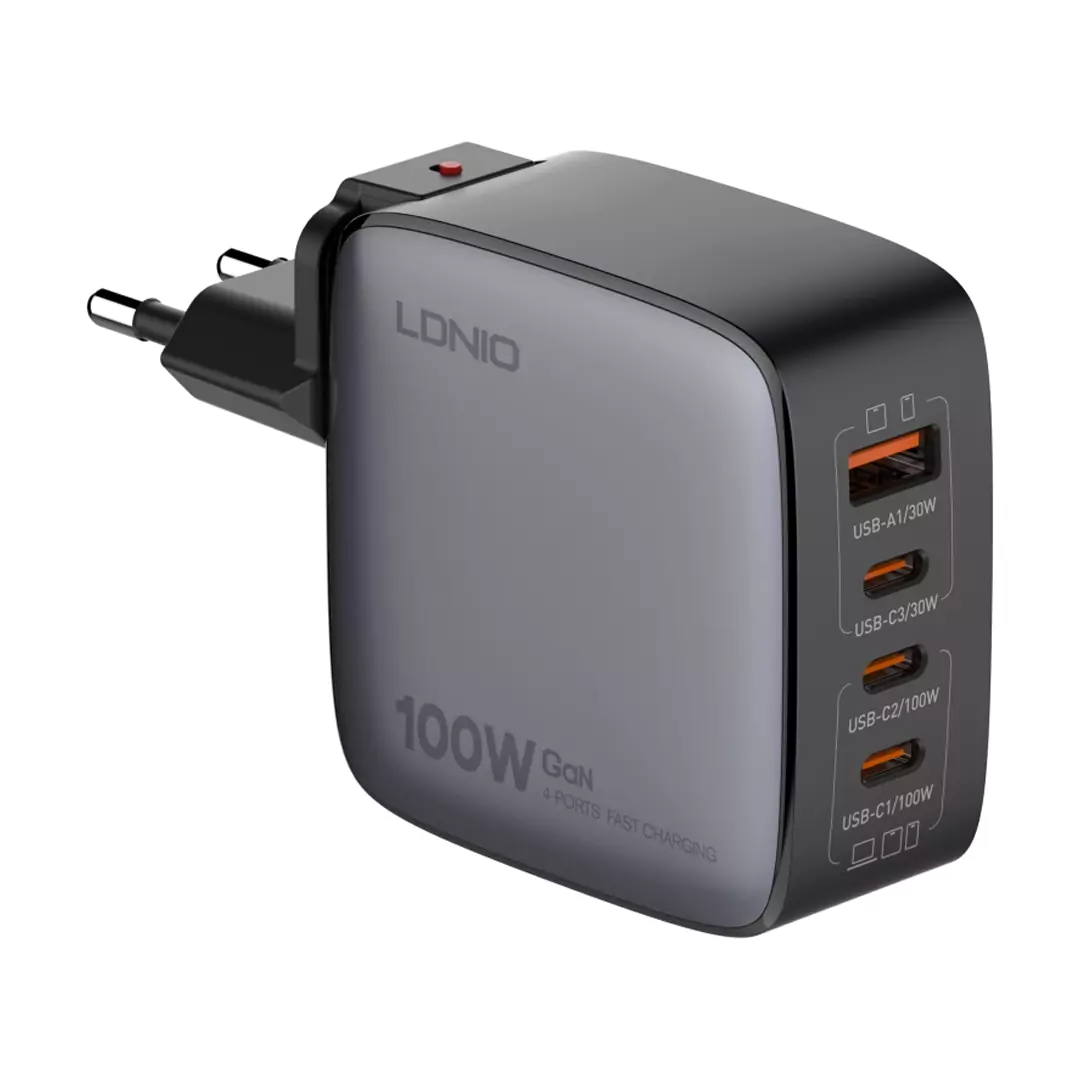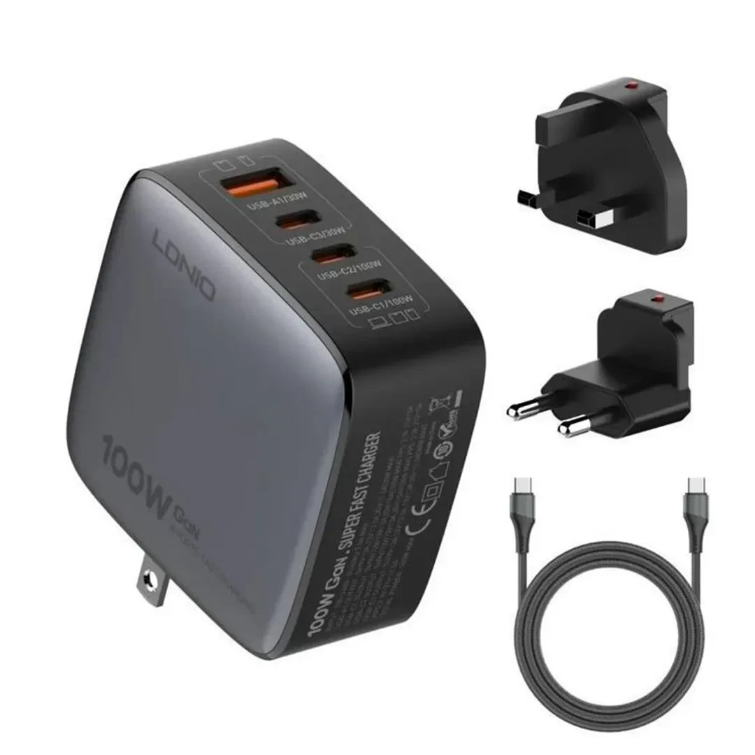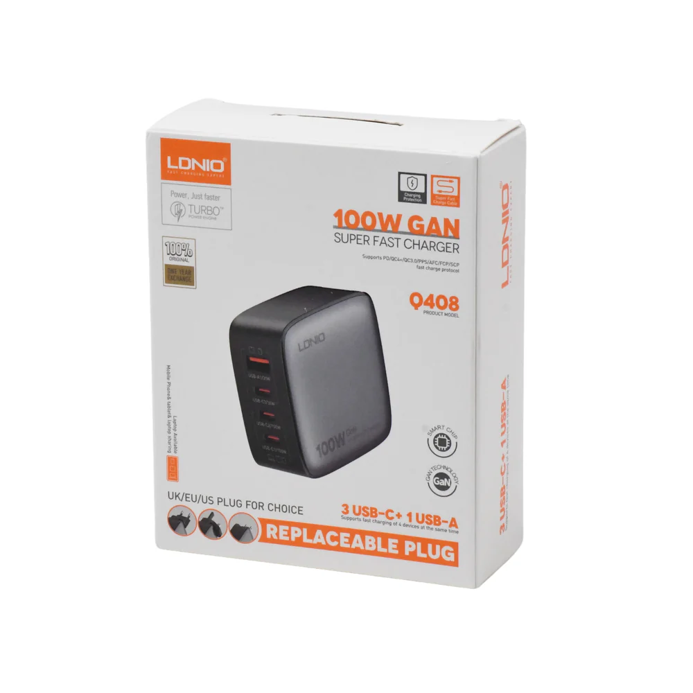 The Ldnio 100W GaN Super Fast Charger Q408 is a high-performance charging solution designed to power up multiple devices simultaneously. Featuring cutting-edge GaN technology, it ensures efficient, fast charging while staying compact and lightweight. This charger is equipped with four USB ports—one USB-A and three USB-C—capable of delivering up to 100W for the USB-C ports and 30W for the USB-A, making it ideal for charging laptops, tablets, smartphones, and more.